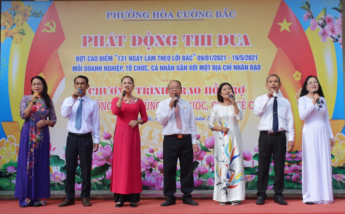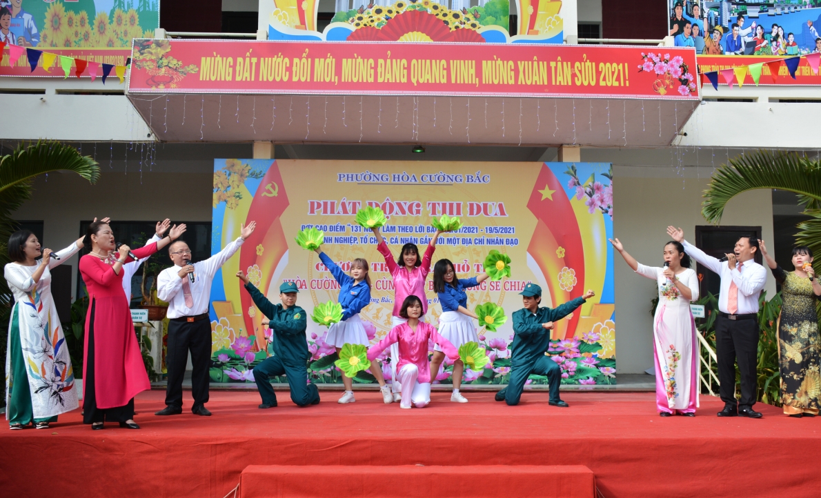 | Biểu diễn văn nghệ tại buổi phát động đợt thi đua cao điểm với chủ đề “Hòa Cường Bắc – Cùng tiếp bước, cùng sẻ chia”. |