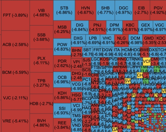 Trên sàn HoSE, không ít thời điểm thị trường có trên 460 mã giảm điểm với gần 40 mã giàm sàn. Trong đó, các mã chứng khoán thuộc nhóm ngành xây dựng, bất động sản giảm sâu, như LHG, VGC, GEX, FCN, HBC... Các nhóm thủy sản, bảo hiểm, cảng biển ban đầu được xem là "ổn định" nhưng do áp lực bán lớn nên cũng không giữ nổi, bắt đầu đà giảm sâu.
