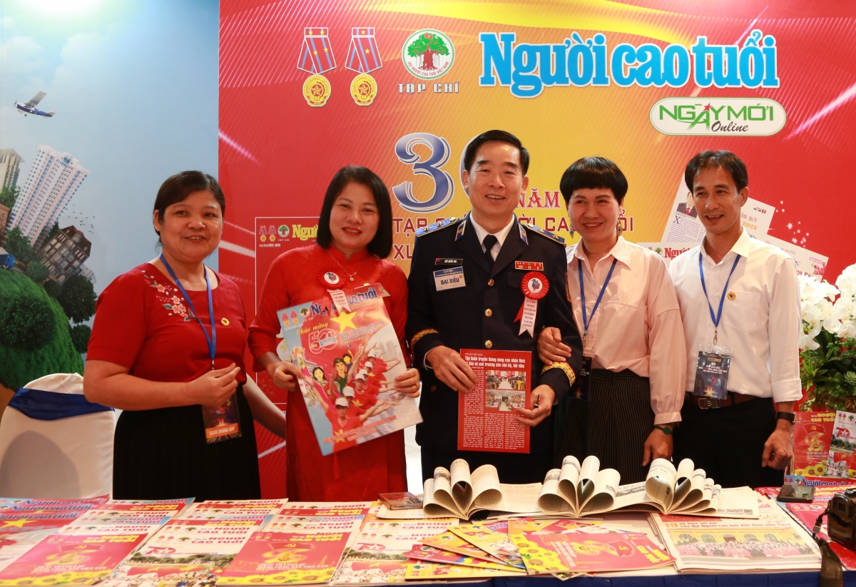 Phó Chủ tịch Thường trực Hội NCT Việt Nam Trương Xuân Cừ, Tổng Biên tập Tạp chí Người cao tuổi Lê Quang, Tổng Biên tập Báo Cựu Chiến binh Việt Nam Đỗ Phú Thọ chụp ảnh lưu niệm tại gian trưng bày. |
